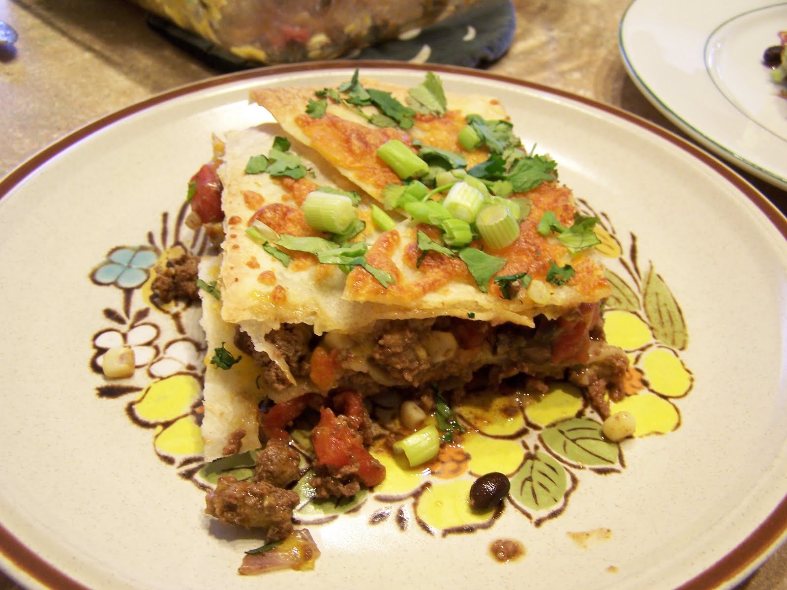 Rub the remaining 1 Tbsp olive oil in a casserole dish. Pour half the beef mixture into the casserole dish, sprinkle on some cheese and layer in half the tortillas. You may need to cut some of the tortillas in half to fit.